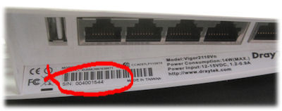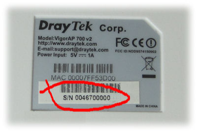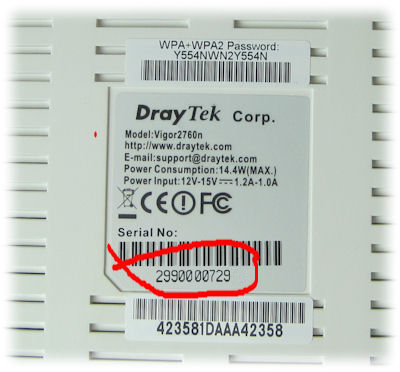 Every DrayTek product has a unique serial number. This is separate to your product code, MAC address, Wireless security key and manufacturing code. You may require your serial number when you register your product warranty, activate optional features or require warranty or support services. The serial number is printed on the product. You should not publish your serial number on the internet; it is unique to your product and should ionly be used for liaision with DrayTek, your supplier or your own inventory tracking/logging. To ensure you get the correct number. Always read the serial number from th ephysical product itself, not any packaging or other documentation.