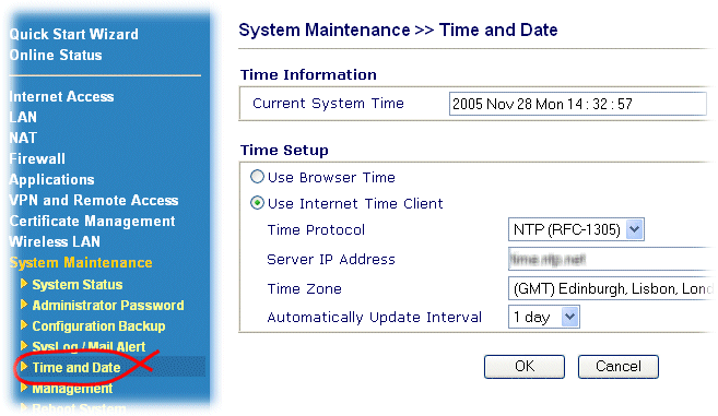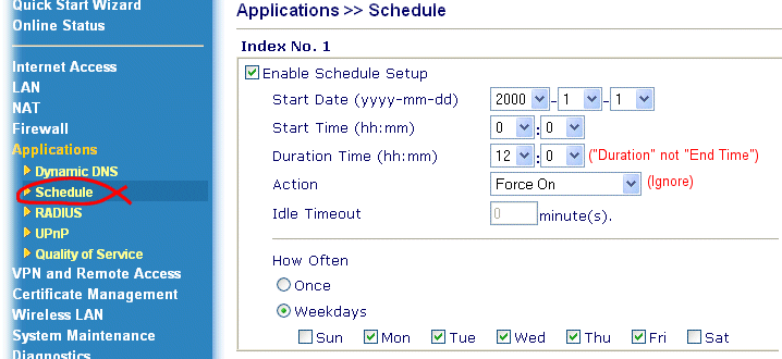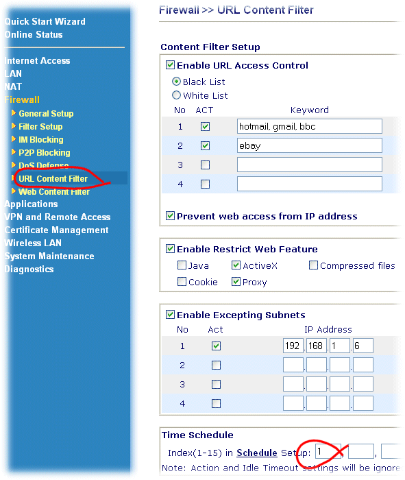 Vigor routers with Content Filtering facilities can have a schedule attached to some of the facilities, for example so that a rule blocking access to email services is not active at 'lunchtime' so that staff are permitted to check their personal email. There are three stages to this:
