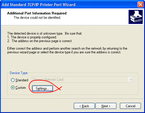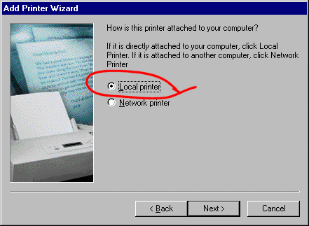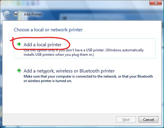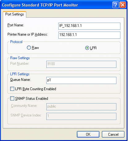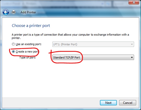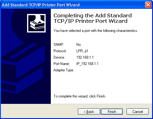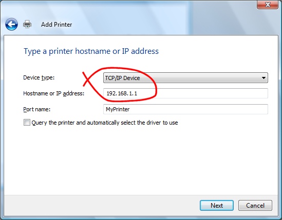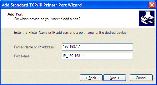 Start at Start -> Settings -> Control Panel -> Printers and follow through these screenshots, copying exactly as shown (though change the IP address if 192.168.1.1 is not your router, of course) :