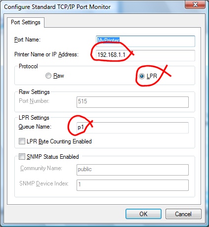 Step6: Change the protocol to LPR and enter the Queue name as p1 (that's a lower case 'p' and the number '1'):