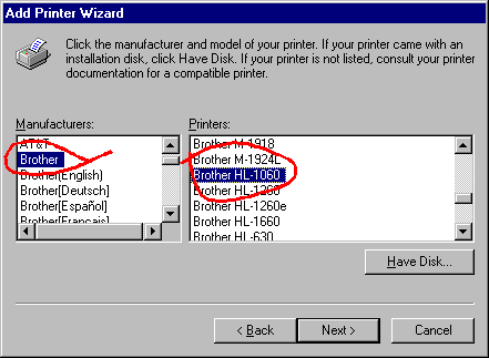 Step7: Now install the printer drivers as normal. Generally you do this using the driver disk/CD supplied by the printer's manufactuter, in which case, click 'have disk':