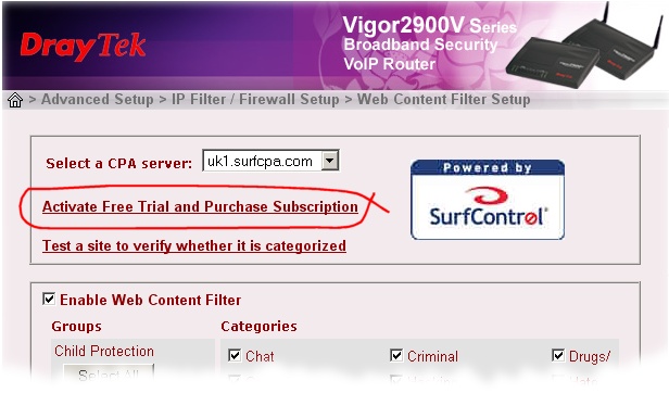 The Vigor's URL Content filtering facility allows the simple blocking of specific URLS, for example if you wanted to restrict access to "hotmail.com". The Web Content Filter is a more compehensive system which will check the category of every web site your users try to visit and only allow access if the site doesn't fall into one of your prohibited categories. for example, you may want to ban all sites categorised as having adult or sexual content. Not all Vigor router's support this facility; please check the product's specification on the main UK web site to see which models support the feature.