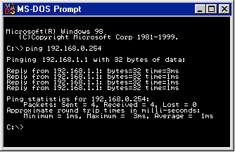 You can send Pings from the MS-DOS prompt the router by typing PING followed by the router’s IP address, as shown below. If the pings Timeout (i.e. are not returned) then the router cannot be seen (pinged) from that PC and you have a problem.