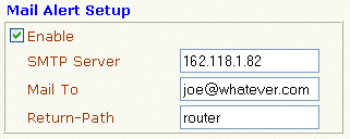 Enabling 'Mail Alert' will cause the router to email your chosen address with certain alerts, notably potential firewall attacks. It is a simple function to set up - go to the Syslog/Mail Alert menu on the router and enter the address of your chosen mail server (local or ISP's) and the addres you want the alerts sent to: