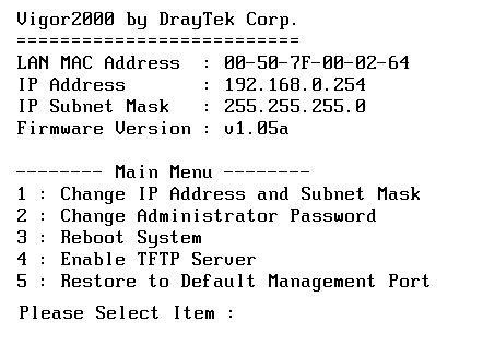 Select "Direct to Com X" where ‘X’ is the COM port you’re using on the PC and select 115200 bps for the serial speed. When all is well, the Vigor console menu will appear :