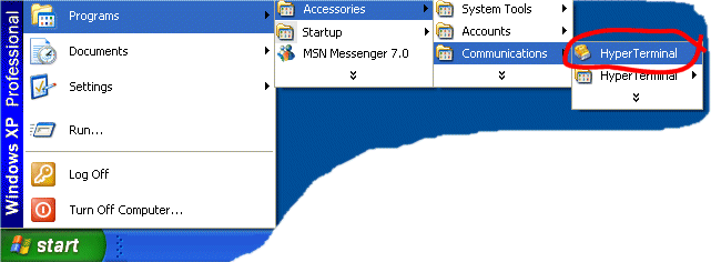 Although WindowsXP/2000 has a default simple Telnet program, it is 'DOS/Console' based, which makes capturing of output difficult (for example to send logs to an engineer). We therefore recommend using the Windows Hyperterminal program instead, which is standard in Windows. Run it from the Start Menu: