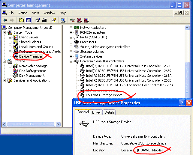 Your USB modem/phone may have an obvious name, so you can immediately identify it. Otherwise, your USB modem might actually be shown as a USB Mass Storage Device because the modems often have built in memory (like a USB memory stick) as well as their modem. Right click on the most likely device and it should be easier to identify the device by the manufacturer name; in the example below, you can see "Huawei" on the General tab.