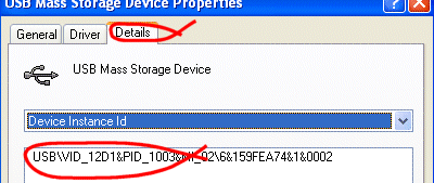 Click on the 'Details' tab, as shown below and here you will find the USB PID/VID numbers. Note those down for later: