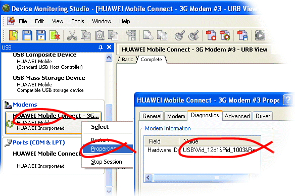 Your USB modem should still be connected to your PC. Load up the DMS software (as shown below). In the left hand pane, you will see your various USB devices. Select your USB modem. It may be listed with an obvious name, or may not. In our example, it's nice and clear as the Huawei modem or USB Composite Device. To be sure we're selecting the right device, right click on it and select properties. If you're really not sure, you could repeat the whole process on more than one device. On the 'diagnostics' tab, you will see the USB PID/VID identifiers; they should match the IDs which you noted down earlier in stage 1. If it doesn't match, try one of the other USB devices:
