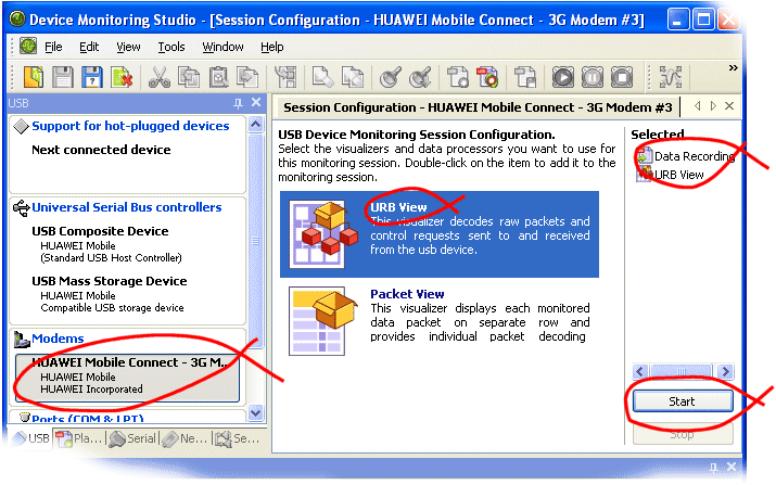 Double click the modem in the left hand panel and the screen below will appear. In the right hand panel, you will see that 'Data Recording' is already listed. Select URB View to add that to the list too. Once that is sown in the right hand panel, click Start to begin capturing.