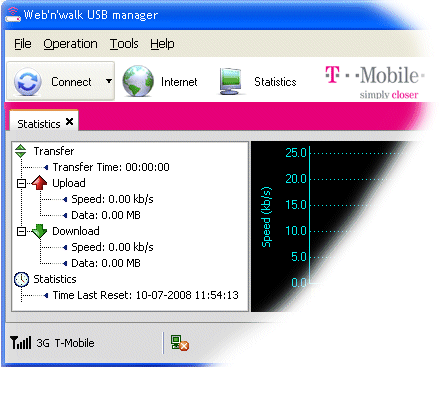 Plug your USB modem/phone back into your PC and once it has been recognised by the PC. Go online to the Internet using the 3G modem. Commonly, this is done with a program provided by your cellphone company. In the example below, we're using T-Mobile and we would press the 'Connect' button: