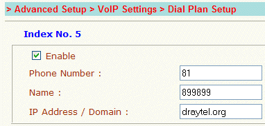 In the above dialplan entry note how the draytel.org suffix is not included in the name and that the name is not included in the domain/IP field (i.e. the johnsmith and draytel.org are entered into separate fields, as shown).