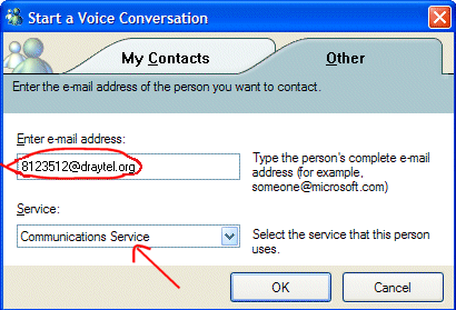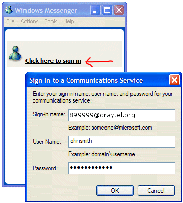 You will need Windows Messenger 4.7 or later (WindowsXP); not to be confused with MSN Messenger (see later). You must firstly set up an account with a SIP registrar service (e.g. draytel.org - see earlier). Set up Windows Messenger to use the SIP service instead of the default Microsoft '.NET Passport' method :