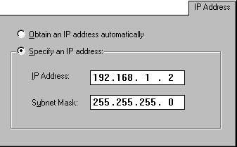 From Windows 98 Control Panel, go to Network and highlightTCP/IP -> Ethernet Adapter and click the Properties button. Go to the IP Address tab :