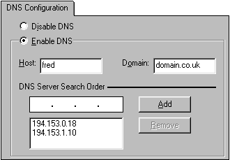 Next, click the DNS Configuration Tab, and enter your ISP’s DNS addresses. The picture below shows an example, but you must use those for your own ISP).