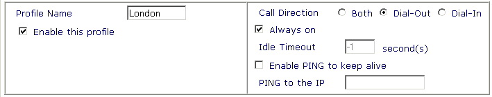 Firstly, as on the first router, from the main router menu, select >> LAN-to-LAN Dialer Profile Setup and select one of the 16 available profiles. This time, we will call it 'London' as that's where we're calling.