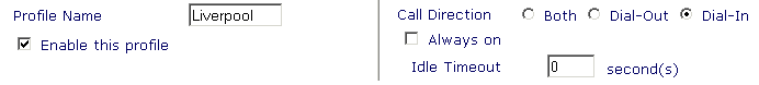 Next, from VPN menu, select >> LAN-to-LAN Dialer Profile Setup and select one of the 16 available profiles. As this profile will allow Liverpool's LAN to access us, we will call the profile "Liverpool". Follow through each of the fields shown below and see how they relate to our original table.
