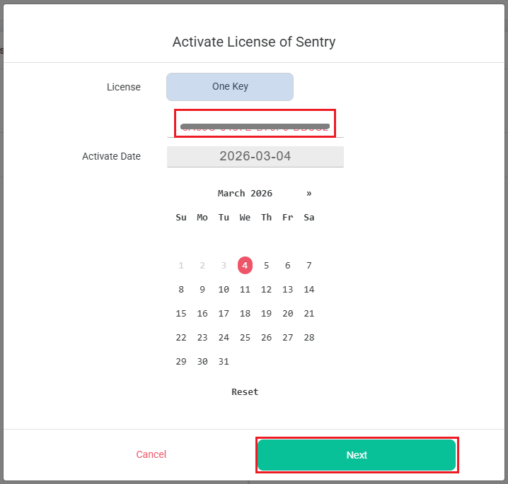 - Enter the license key, select a start date for the Threat Protection license, then click Next to continue.
