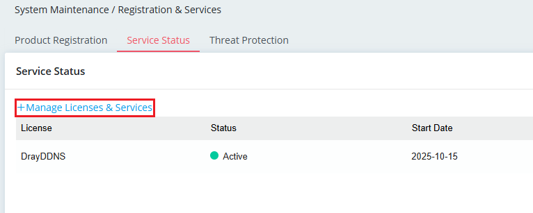 - Go to System Maintenance / Registration & Services. In the Service Status tab, click +Manage Licenses & Services. This will redirect you to the MyVigor login page.