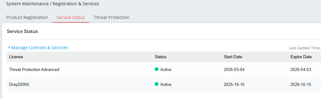 Log in router's WUI interface. We can see the Threat Protection license is active in System Maintenance / Registration & Services / Service Status.
